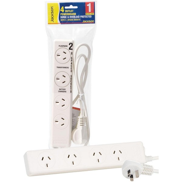 Jackson 4 way Protected Power Board requires just 1 power socket to offer power from 4 sockets. 2 ports are double spaced for your convenience and the power cord is 1 metre long.