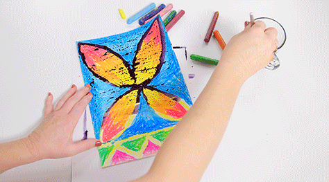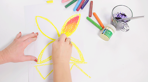 Use crayon to colour inside your chalk outlines. Make sure you use a heavy layer of crayon that goes right up to the edge of the line and no paper can be seen through the crayon. Be careful not to colour over your chalk lines. Try and blend colours together to create depth in your picture.