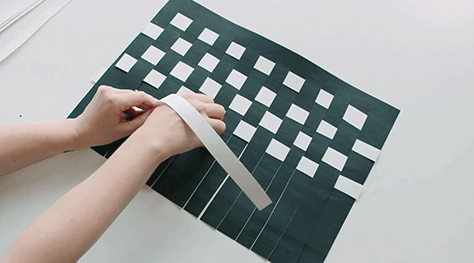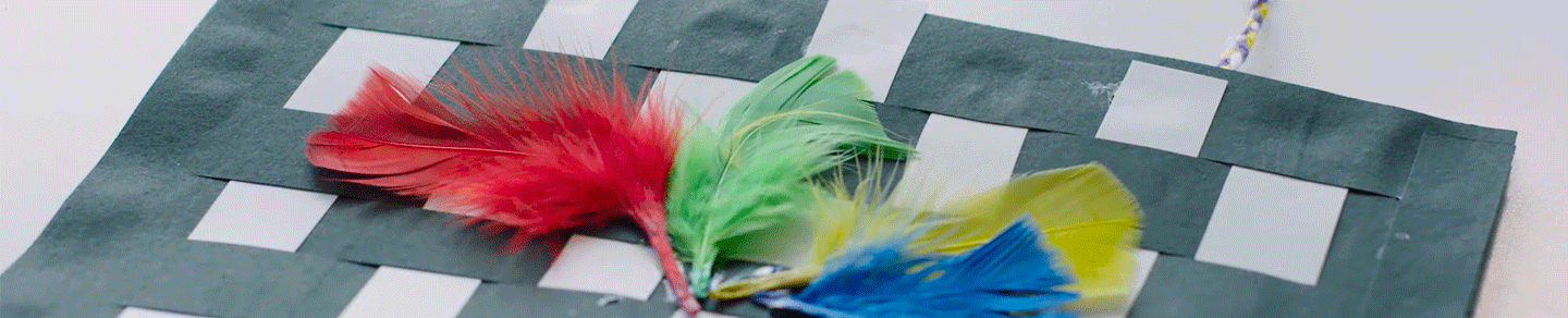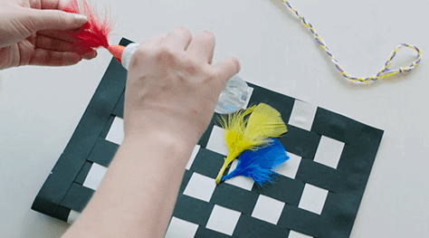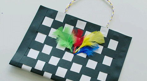 Weave black paper with the strips of rubbed paper to make the Kete. Weave the paper over and under to create a contrasting pattern. Glue all of the loose ends together. Once dry, fold in half, and glue the sides together.