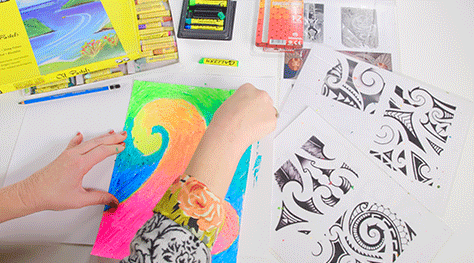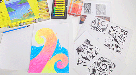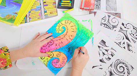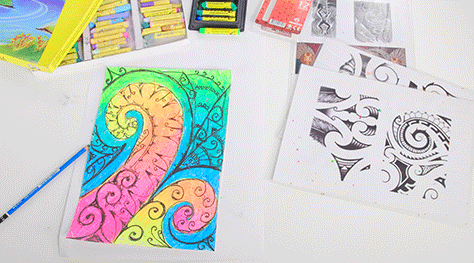 Using oil pastels, colour in your shapes blending colours together. Lighter colours will show off the pencil designs better.